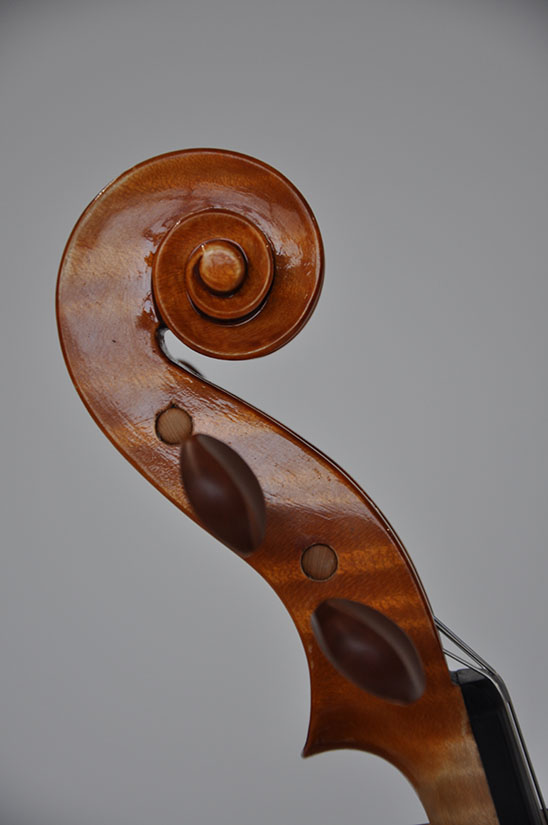 Ausstattung: Saitenhalter, Kinnhalter und Wirbeln aus Buchsbaum; Obligatosaiten von Pirastro. Klangeingestellt.